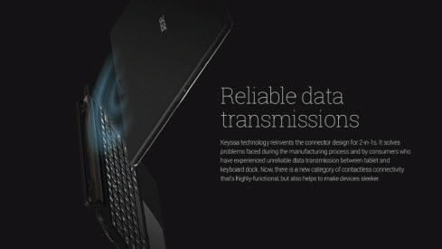 “Keyssa technology allowed the Acer Aspire Switch 12 S to maintain a reliable, high-speed connection between the device and keyboard dock without using any mechanical connectors or pogo pins. The technology helped us to keep the Aspire Switch 12 S as slim and sleek as it is now, without sacrificing on performance and power.”